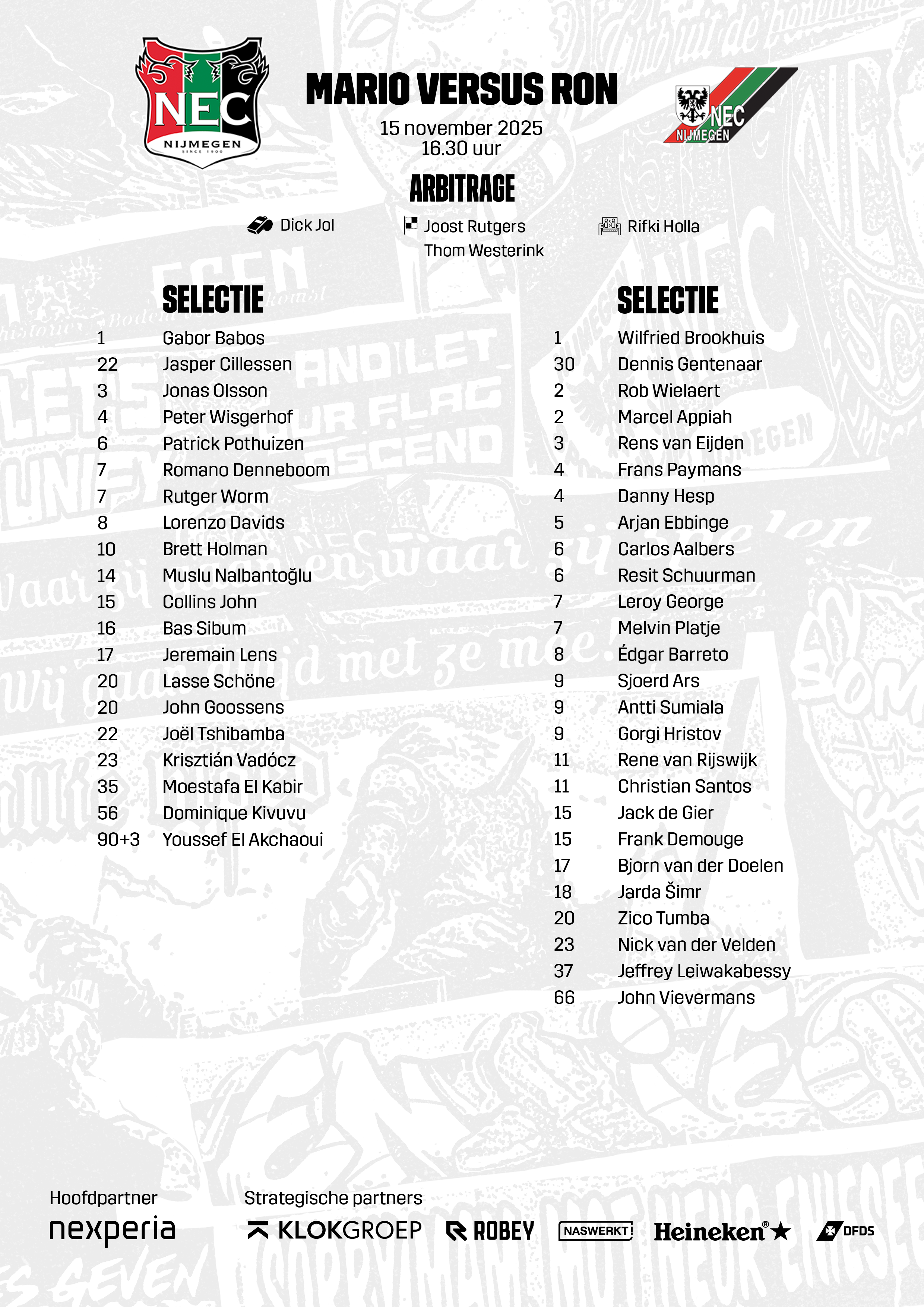 Op zaterdag 15 november viert N.E.C. haar 125-jarig bestaan samen met supporters én haar helden van weleer. Nog eenmaal keren iconen van de Nijmeegse club terug op het veld in het Goffertstadion om aan te treden in de jubileumwedstrijd: Mario vs Ron.